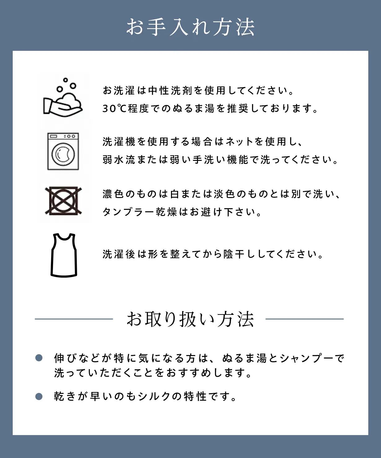 当サイトの商品は、100年以上シルクと向き合ってきた当社だからこそできる、商品ごとに合わせた糸と編み方を厳選しています。